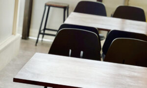 もう1つの理由として、平野さんが座っているイスとテーブルがメンローパーク・コーヒーのものとそっくりな点が挙げられます。